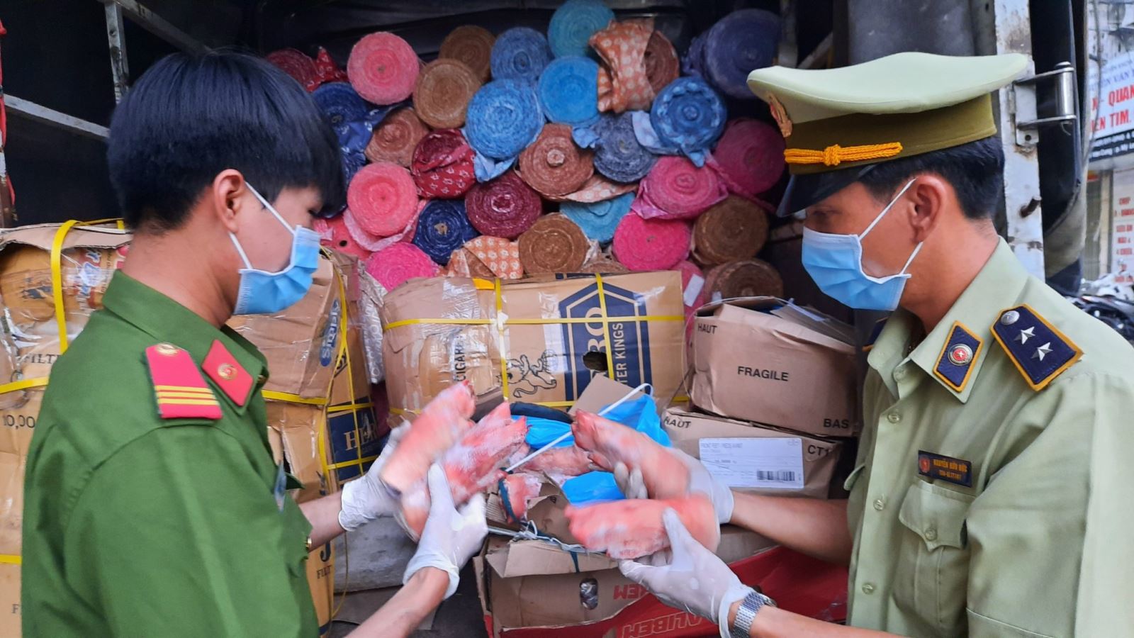 Đội QLTT số 1 khám phương tiện ô tô tải biển kiểm soát 67C-089.87 phát hiện 490 kg chân lợn đông lạnh và 310 kg vải Polyester K44-64