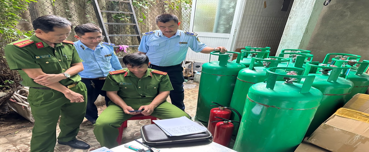 Triển khai thực hiện Công văn về việc phối hợp thực hiện cao điểm tấn công, trấn áp tội phạm đảm bảo ANTT tết Nguyên đán Giáp Thìn 2024 của Ban chỉ đạo 138/CP và Kế hoạch Cao điểm chống buôn lậu, gian lận thương mại và hàng giả các tháng cuối năm 2023; dịp trước, trong và sau Tết Nguyên đán Giáp Thìn 2024 của Cục Quản lý thị trường Quảng Ngãi, chiều ngày 17/12/2023, Đội QLTT số 2 - Cục QLTT tỉnh Quảng Ngãi phối hợp với Công an phường Phổ Thạnh (chủ trì), các Đội nghiệp vụ - Công an thị xã Đức Phổ, Đồn Biên phòng Sa Huỳnh và Viện kiểm sát nhân dân thị xã Đức Phổ tiến hàng kiểm tra địa điểm san, chiết gas trái phép tại TDP. La Vân, phường Phổ Thạnh, do ông V.T.H, sinh năm 1983, ngụ tại TDP Thạnh Đức 1, phường Phổ Thạnh làm chủ. Tại thời điểm kiểm tra, lực lượng chức năng phát hiện 04 đối tượng do ông V.T.H trực tiếp hướng dẫn thực hiện, đang tiến hành san, chiết gas trái phép từ bình gas loại 45 kg sang các bình gas mini có nhãn hiệu H&T ngoài vỏ bình.
