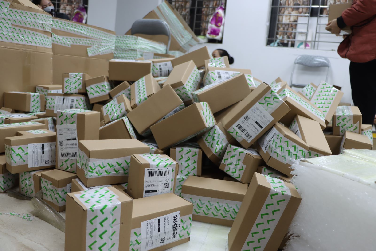 Đơn hàng được đóng gói chất đống, ngổn ngang trên các mặt sàn