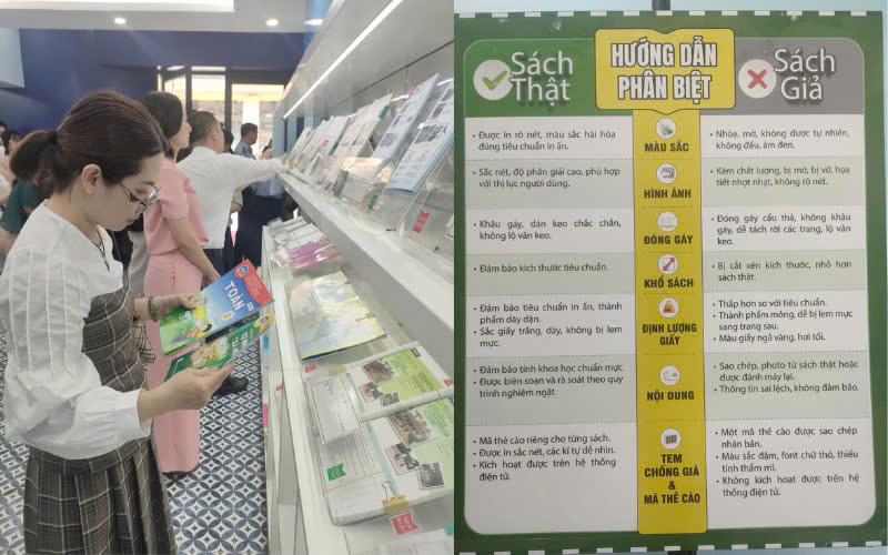 Tại phòng trưng bày sách, điểm nhấn chính là các loại sách giáo khoa, vở bài tập, sách tham khảo với những dấu hiệu phân biệt thật - giả về màu sắc, hình ảnh, khổ sách, định lượng giấy, nội dung, tem chống giả và mã thẻ cào, giúp khách tham quan có thêm kiến thức, kỹ năng trong việc nhận diện đúng sách để đảm bảo quyền lợi cho các em học sinh.