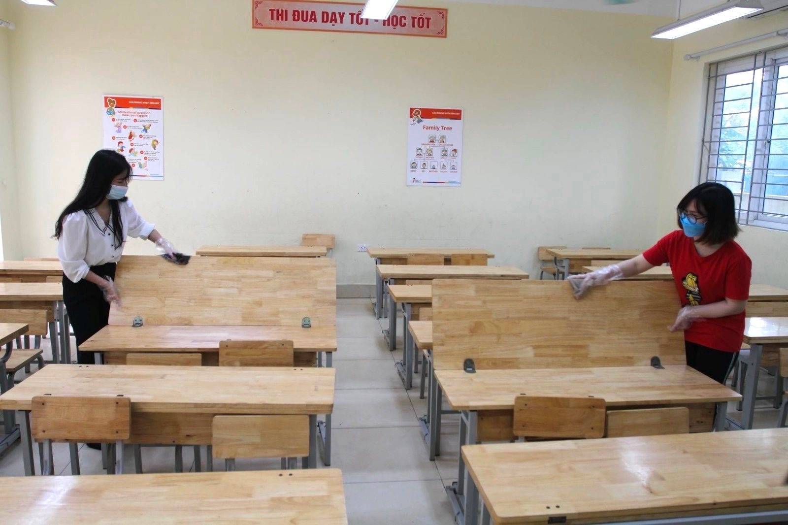Giáo viên Trường Tiểu học Ngô Sĩ Kiện (huyện Thanh Trì) vệ sinh bàn ghế để đón học sinh trở lại trường. Ảnh: Hà Nội mới