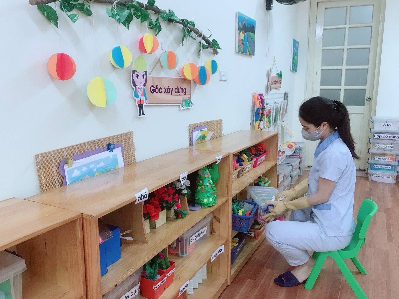 Giáo viên Trường Mầm non Đinh Tiên Hoàng (quận Hoàn Kiếm) vệ sinh đồ dùng, đồ chơi của trẻ. Ảnh: Hà Nội mới