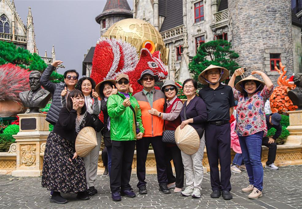 Du khách Hàn Quốc thích thú check in với nón lá Việt Nam tại khu vực Quảng trường Hội tụ. Hàn Quốc cũng là thị trường khách quốc tế lớn nhất đến Bà Nà từ đầu năm đến nay, chiếm khoảng trên 30% tổng lượng khách đến khu du lịch.