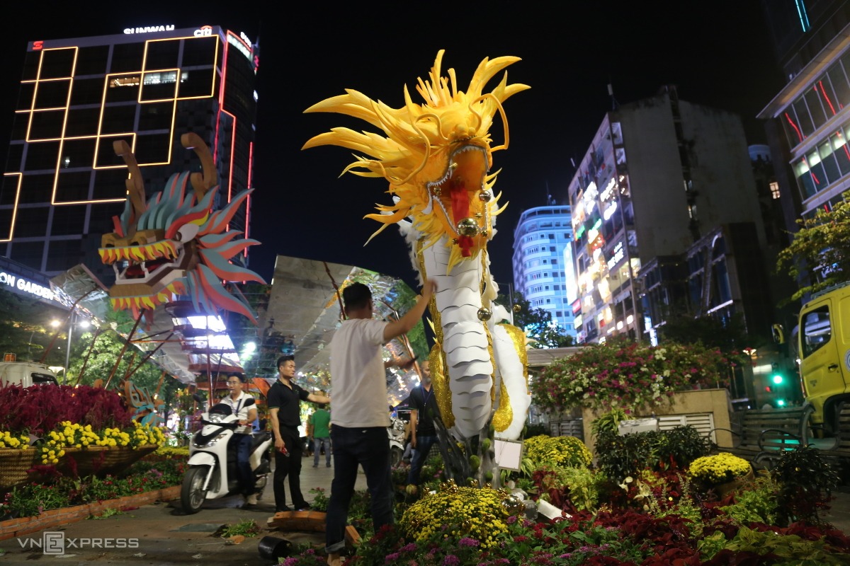 Tối mùng 5 Tết (14/2), hàng trăm công nhân thu dọn tiểu cảnh, linh vật ở đường hoa để trả lại mặt bằng phố đi bộ Nguyễn Huệ. Việc tháo dỡ đường hoa sẽ được thực hiện trong 2 ngày, riêng linh vật rồng khổng lồ sẽ được giữ tới 9/3 cho du khách tham quan.
